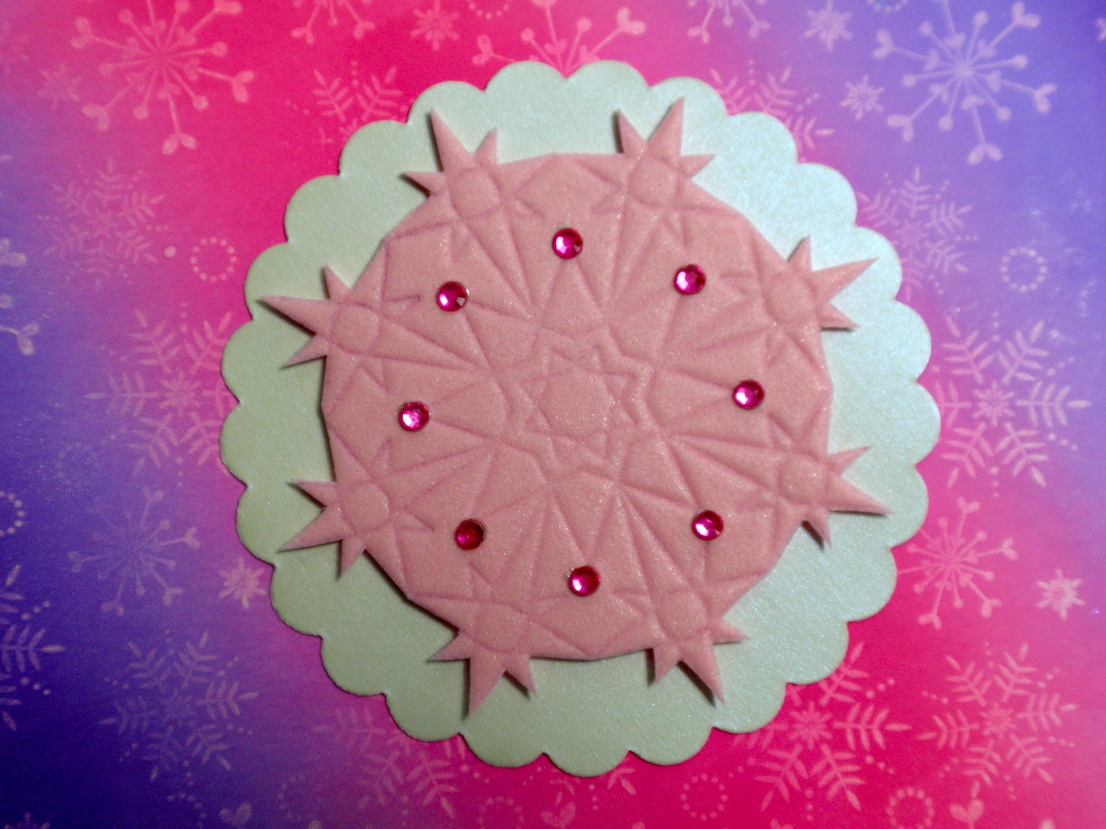 This came together when I spotted how the heart motif found in the stamped image is echoed in one of the snowflakes (which I embellished with a pearl).